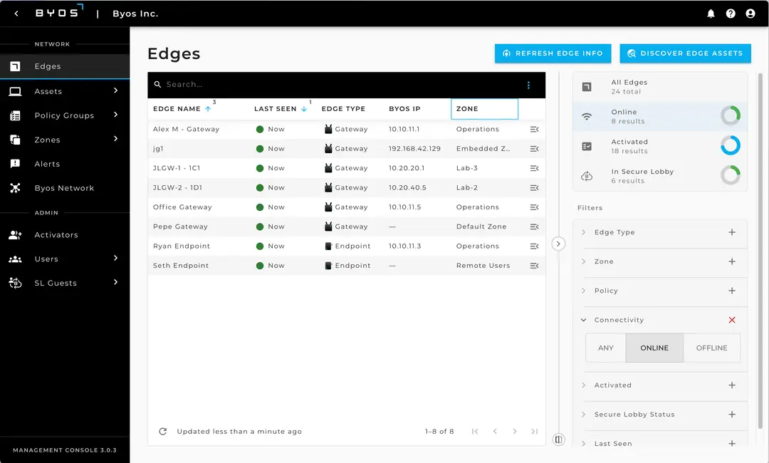 View all of your Edges and connected Assets in the Byos Secure Lobby™ Overlay network. Control and Manage access control traffic rules, asset visibility, and third-party access from a single screen.